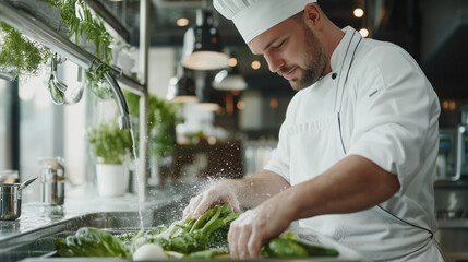 Chef Cleaning Fresh Vegetables in Kitchen Sink