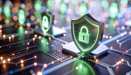 Cybersecurity concept with green shield and data encryption visual
