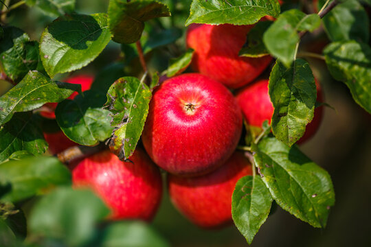 large ripe red apples hanging from tree branch in orchard ready for harvesting