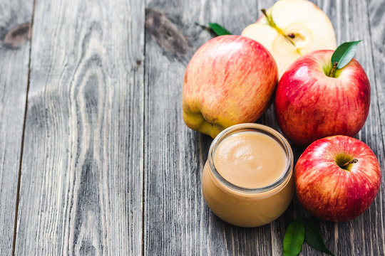 Fresh ripe apples in wicker basket on grey table, closeup. Space for text