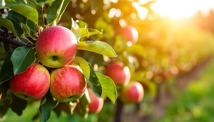 Bright red apples hanging from a branch in a sunny orchard during the harvest season on a transparent background