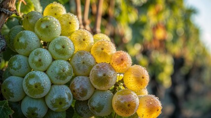 fresh green and golden grapes with morning dew hanging on a vine in sunlight, close-up macro view of ripe grape cluster in vineyard during harvest season