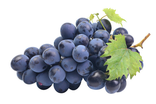 Fresh ripe muscadine grapes with deep purple and burgundy colors isolated on white background, showing natural bloom coating and stems. Macro food photography.