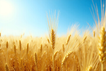 Wheat field with golden stalks under blue sky