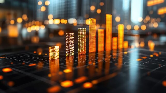 Digital trading dashboard showing rising bar chart and trend lines for investment analysis