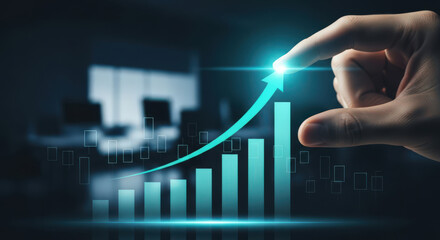 Hand placing a green arrow on a rising bar graph, symbolizing business growth and success