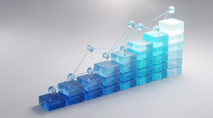 Glass-like 3D blocks forming a rising bar chart with connected spheres representing a growth trend on a clean gradient background.