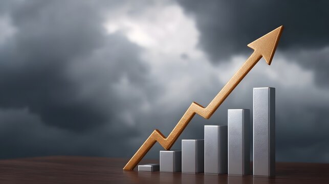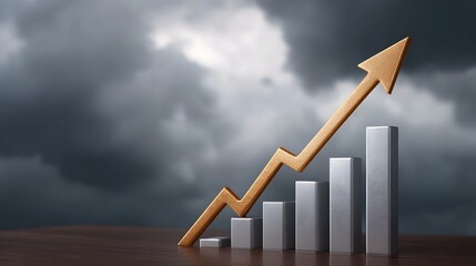 A metallic bar graph shows upward growth against a dramatic stormy sky symbolizing financial uncertainty or challenge