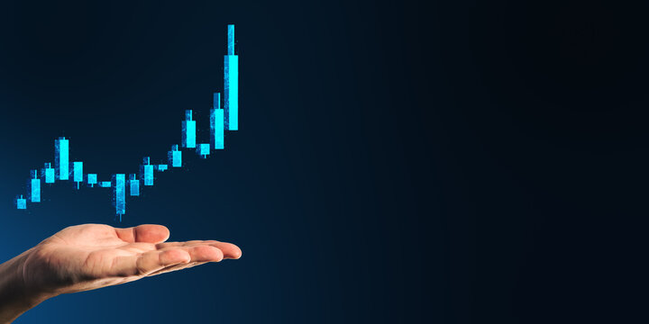 Businessperson hand showing rising forex candlestick chart on dark background as concept of investment growth and digital financial market data.