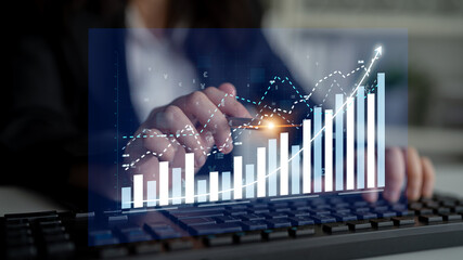 Interactive financial growth: Hand navigating a rising graph on a digital interface
