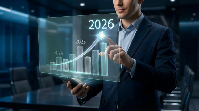 Businessman analyzing 2026 financial growth graph on holographic interface