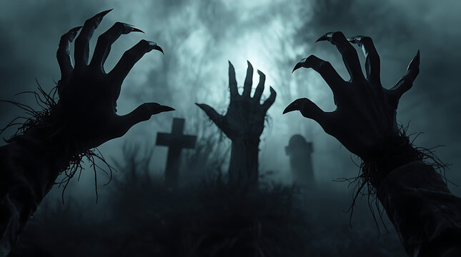 Halloween background features a shadow overlay effect with terrifying hands displaying long nails, a creepy monster claw, and a silhouette of hands, alongside a zombie hand rising from a graveyard.