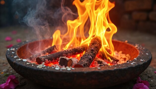 Flames erupt from burning logs in dark, rustic bowl, sending smoke signals into night. Petals adorn ground near glowing embers of ritualistic fire, inviting contemplation, offering space for text.