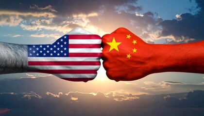 Fists painted with U.S. and China flags colliding over cracked gray surface symbolizing geopolitical rivalry