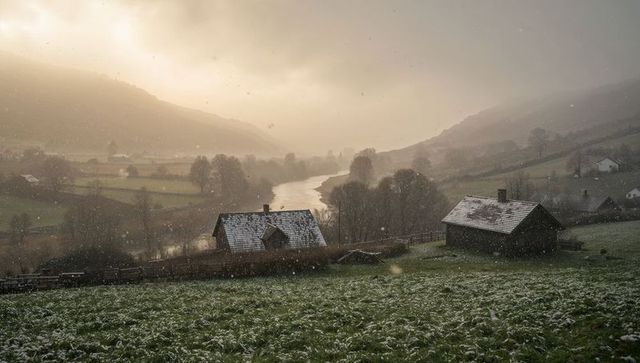 Snow-dusted barns overlooking misty river valley at golden sunrise, tranquil rural meadow