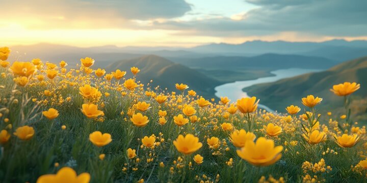 Bright yellow flowers bloom in a serene landscape at sunset near a flowing river