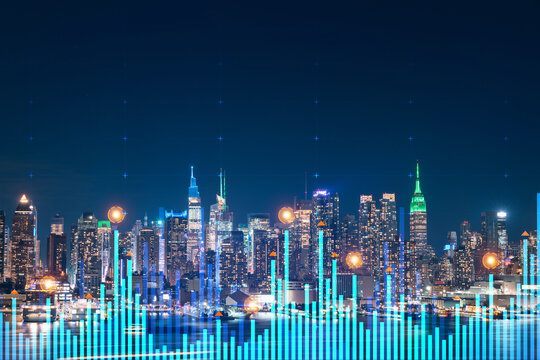 Skyscrapers Cityscape Downtown View, New York Skyline Buildings. Beautiful Real Estate. Night time. Forex Financial graph and chart hologram. Business education concept.