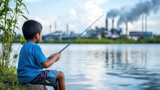 A young boy sits on a rock, fishing by the river as smoke billows from factories nearby