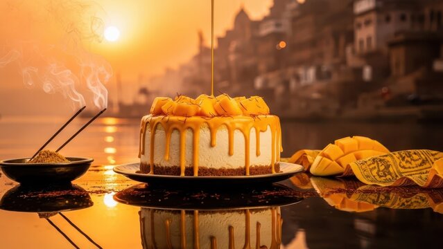 Avocado and almonds on wooden board with overlay sunset scene