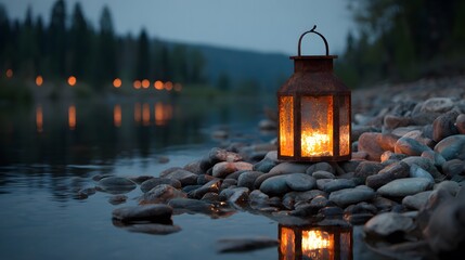 Dramatic lightning strike over majestic mountain river during storm