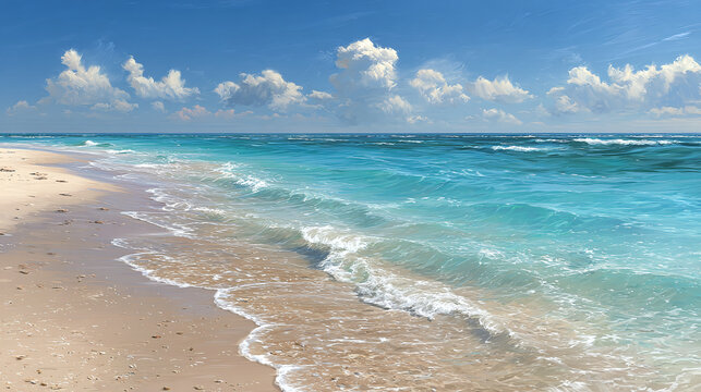 A captivating beach scene featuring turquoise water, a sandy shore, and fluffy clouds