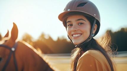 A young girl wearing a riding helmet smiles while sitting next to her horse during a sunny day at an equestrian center.