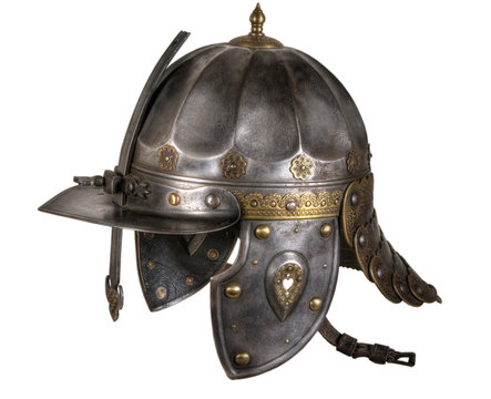 Medieval helmet with silver-bronze tones and riveted visor, evoking strength and historical craftsmanship  white background