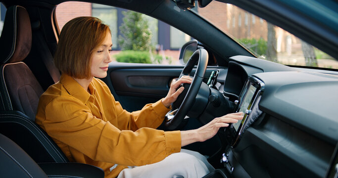 Beautiful young woman setting up navigation on a screen inside a modern car, preparing for a road trip. Concept of technology, travel, connectivity, and contemporary lifestyle