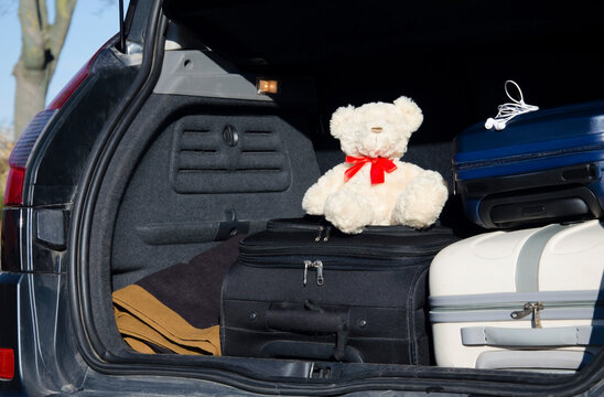 Open car trunk filled with suitcases and a teddy bear, symbolizing family travel, road trip, vacation, and journey by car.