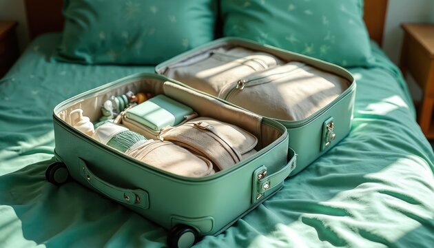 Mint green suitcase filled with travel essentials and toiletries sits open on a rumpled bed. Clothes are neatly folded inside the luggage, ready for a journey.