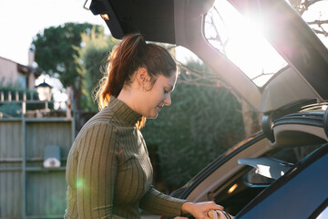 Smiling young woman loading car trunk at sunset with warm natural light. Concept of modern lifestyle, everyday travel and female autonomy