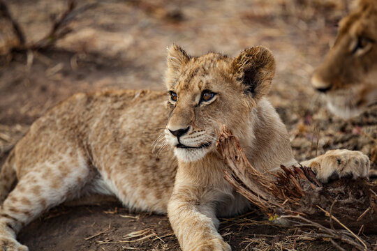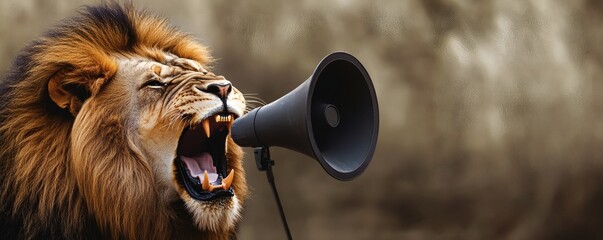 Face to face between a kitten and a lion roaring. Close-up of a cute kitten looking in the mirror, in the mirror the head of a roaring lion.