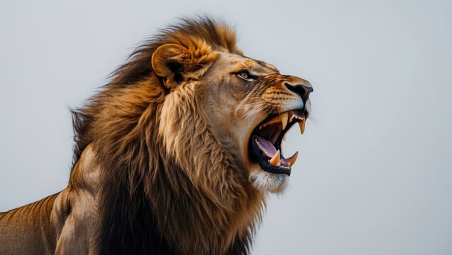 Isolated on white, male lion showing aggression by roaring and baring his canines
