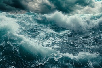 The photo captures a large body of water with numerous powerful and crashing waves, creating a dynamic and energetic scene, Frantic ocean under hurricane winds, AI Generated