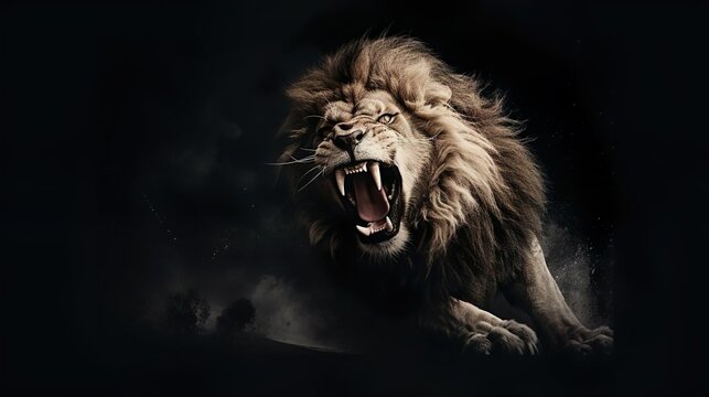 Dramatic portrait of a roaring male lion against a stark black background showcasing its power and