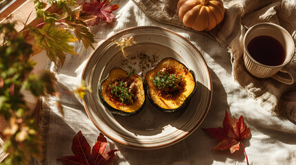 Autumn harvest feast: halved roasted acorn squash on rustic plate, coffee, small pumpkin, and colorful leaves.