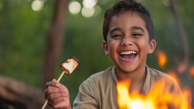Happy child roasts a delicious marshmallow over a campfire, giggling and savoring the cozy moment, reflecting the delight of outdoor childhood experiences