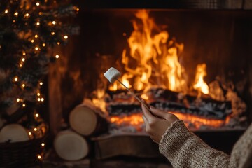 Cozy Winter Scene by the Fireplace with Marshmallow Roasting and Warm Lights.