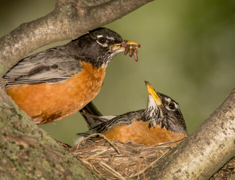 Parent Robin bird feeding juvenile