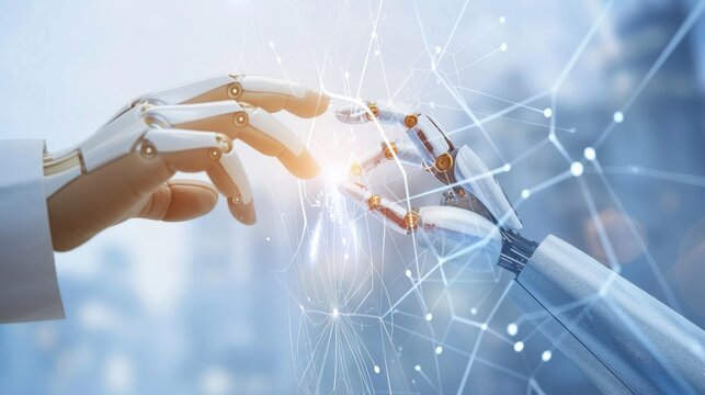 A robot hand and human hand touching, with a digital network overlay, symbolizing artificial intelligence and technological innovation