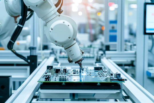 Advanced High Precision Robot Arms inside Bright Electronics Factory. Fully Automated Modern PCB Assembly Line. Electronic Devices Production Industry. Quality Control of Circuit Board