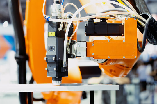 Orange pick and place robotic clamp arm manipulator moving red toy blocks at modern robot trade show, exhibition. Manufacturing, engineering, industrial, ai, automated technology concept