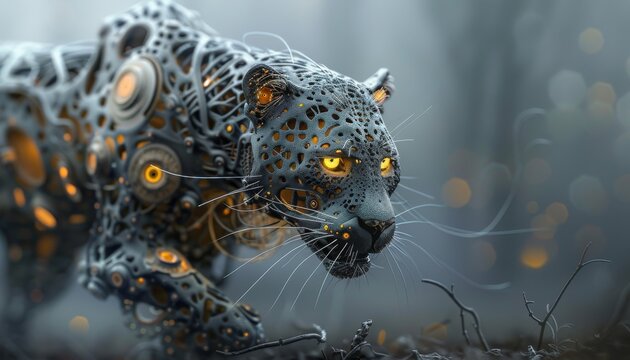 A futuristic cyborg dinosaur with a metallic robotic body.
