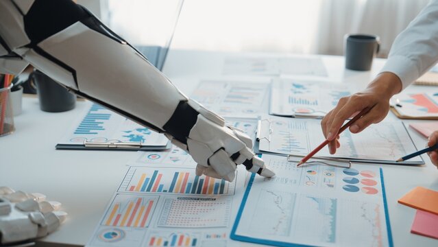 A robot arm assists a human in analyzing business data during a meeting, showcasing the blend of technology and human collaboration in a modern office setting.Noogenesis