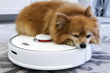 A red dog sleeps quietly on a white robot vacuum cleaner that quietly cleans the gray carpet