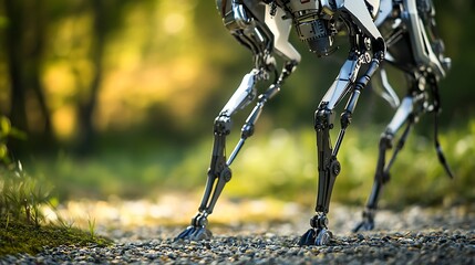 A close-up view of a futuristic robot dog standing on a gravel path surrounded by lush green grass, showcasing metallic legs and intricate robotic design under natural lighting