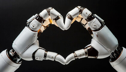 Close-up of a humanoid robot hands in the form of heart (heart shape), isolated on black background with copy space. Love artificial intelligence concept. Generative Ai.