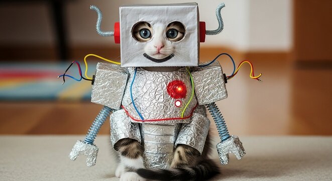 Whimsical robot cat costume: A curious kitten dressed as a silver robot with a cardboard box head and spring arms sits on a carpeted floor, creating a playful and humorous image.