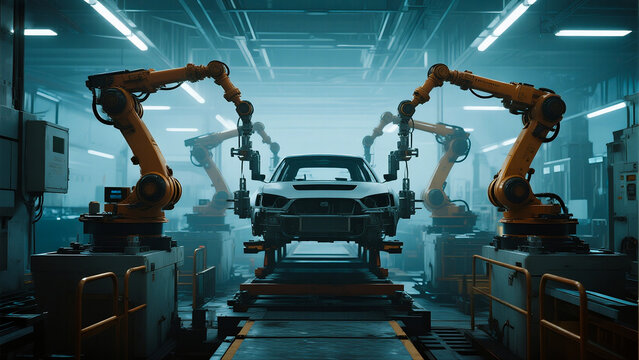 A high-tech robotic assembly line in an automotive factory, featuring multiple robotic arms working on a car chassis.