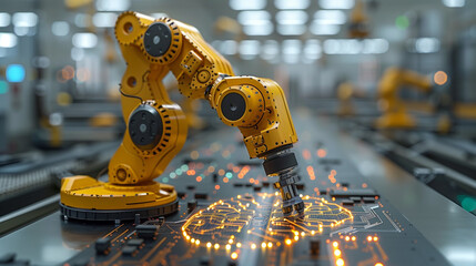 robotic arm work to assemble circuit boards on a production line.  environment highlights advanced technology in electronics manufacturing